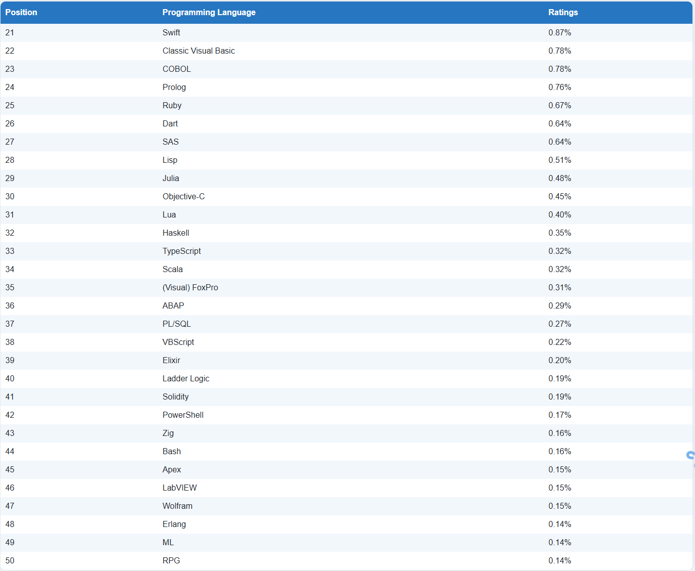 ActionScript, Algol, Alice, Awk, B4X, Caml, CLIPS, Clojure, Common Lisp, Crystal, D, Elm, F#, Forth, GAMS, Groovy, Hack, Icon, Inform, Io, J, JScript, Logo, Maple, Modula-2, Mojo, MQL5, NATURAL, Nim, Oberon, OCaml, Occam, OpenCL, PL/I, Q, REXX, S, Scheme, Simulink, Smalltalk, SPARK, SPSS, Stata, SystemVerilog, Tcl, Transact-SQL, V, VHDL, X++, Xojo