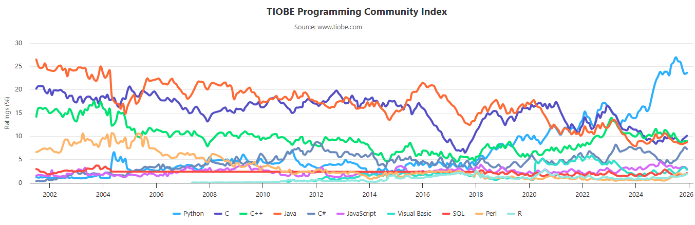 TOP 10 编程语言 TIOBE 指数走势(2002-2026)