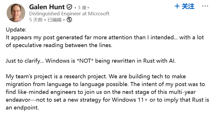 此言一出引发了广泛的关注与讨论。鉴于此,Galen Hunt 不得不再次出面进行澄清表示,微软目前并没有用 Rust 语言配合 AI 进行重写 Windows 系统的计划: